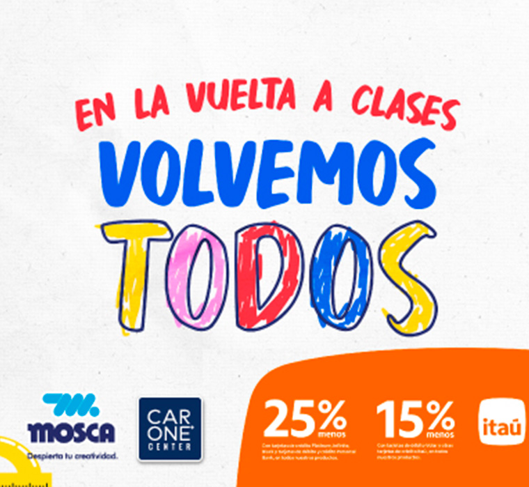 En esta vuelta a clases, del 1/02 al 1/03, vení a Mosca en Car One Center y encontrá tus infaltables con hasta 25% OFF pagando con tarjetas de crédito o débito ITAÚ.
